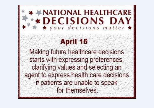 April 16, 2020 National Healthcare Decisions Day National Healthcare Decisions Day educates the public to take part in important advance care planning. The observance emphasizes the importance of advance directives which empower the public and healthcare providers to make inform...