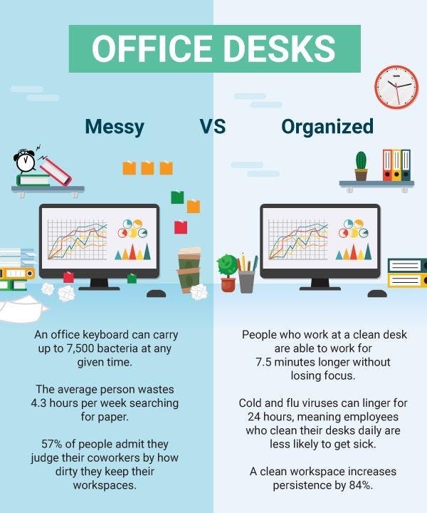 There are a number of benefits that come from keeping a clean desk. You'll look more professional and you’ll save time not looking for a misplaced invoice or meeting notes. Aside from workplace benefits,studies show a well-organized desk also has some psychological p...