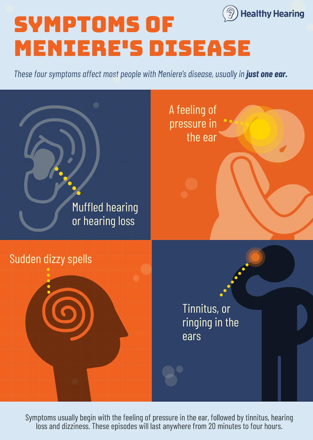 Some individuals with Ménière’s disease have attacks that start with tinnitus (ear noises), a loss of hearing, or a full feeling or pressure in the affected ear. It is important to remember that all of these symptoms are unpredictable. Typically, the attack is characterized by a combination of vertigo, tinnitus, and hearing loss lasting several hours. People experience these discomforts at varying frequencies, durations, and intensities. Some may feel slight vertigo a few times a year. Others may be occasionally disturbed by intense, uncontrollable tinnitus while sleeping. Ménière’s disease sufferers may also notice a hearing loss and feel unsteady all day long for prolonged periods. Other occasional symptoms of Ménière’s disease include headaches, abdominal discomfort, and diarrhea. A person’s hearing tends to recover between attacks but over time becomes worse.