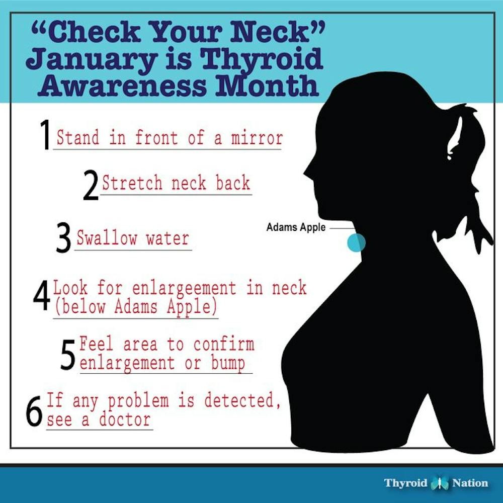 Did you know your thyroid gland makes hormones that help control the function of many of your body’s organs, including your heart, brain, liver, kidneys, and skin? Making sure that your thyroid gland is healthy is important to your body’s overall well-being. An estimated 15 million of Americans have undiagnosed thyroid problems. You can perform a simple self-examination to help with early detection and in some cases, help you find lumps or enlargements in the neck that may point to a thyroid condition.