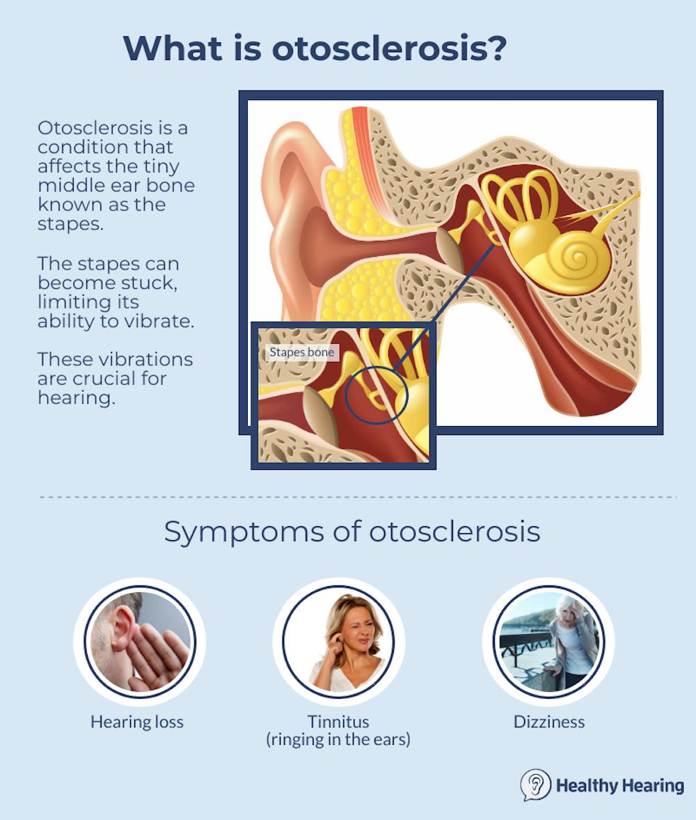 In addition to hearing loss, some people with otosclerosis may experience dizziness, balance problems, or tinnitus. Tinnitus is a sensation of ringing, roaring, buzzing, or hissing in the ears or head that accompanies many forms of hearing loss.