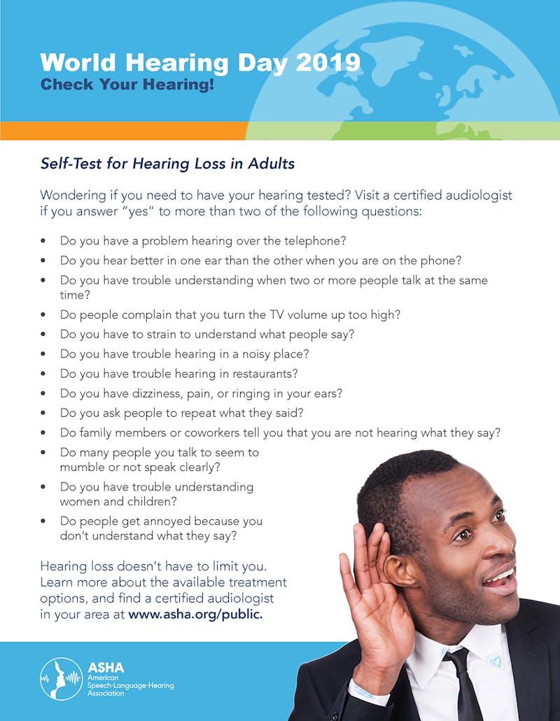World Hearing Day, an observance designated by the World Health Organization, aims to raise awareness and promote ear and hearing care across the world. The 2019 World Hearing Day theme is “Check Your Hearing!” This aims to draw attention to the importance of early identification and intervention for hearing loss.